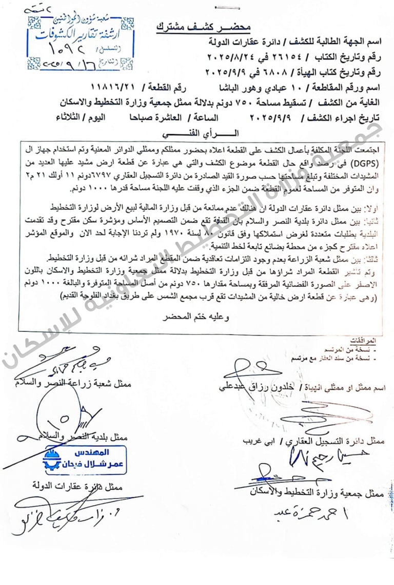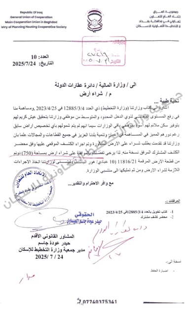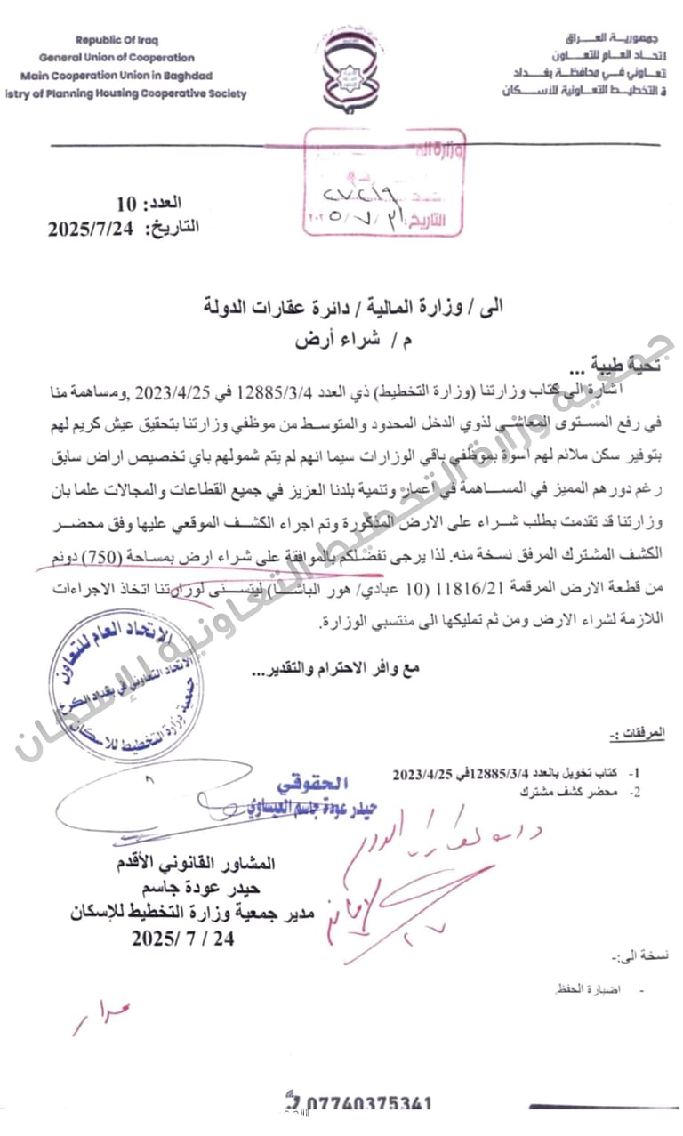 تم استحصال موافقة السيدة معالي وزيرة المالية على تخصيص مساحة قدرها (750) دونم في قضاء أبو غريب لصالح الوزارة، والشروع باستكمال جميع الإجراءات الأصولية المتعلقة بتسجيل الأرض وتخصيصها وفقاً للضوابط والتعليمات النافذة. ويُعد هذا الإنجاز خطوة مهمة لتهيئة مساحة استراتيجية يمكن استثمارها في إنشاء مشاريع خدمية أو سكنية مستقبلية تخدم منتسبي الوزارة وتنسجم مع خطط التنمية في المنطقة.