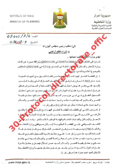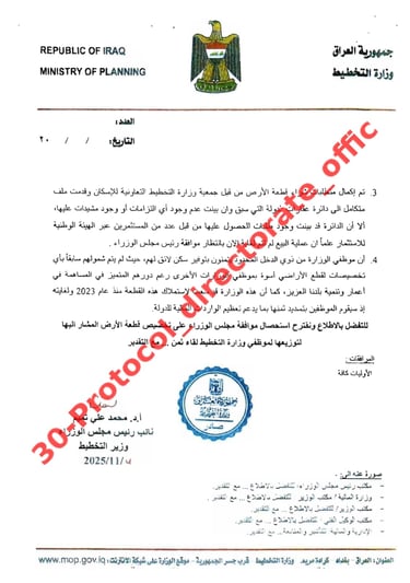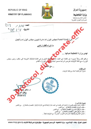 نبارك لجميع منتسبي وزارة التخطيط بمناسبة تصويت مجلس الوزراء على شراء قطعة الأرض في أبو غريب، تمهيدًا لتوزيعها وتمليكها إلى منتسبي الوزارة، تقديرًا لجهودهم وعطائهم المتميز.نتقدم بجزيل الشكر والعرفان إلى معالي وزير التخطيط الدكتور محمد تميم على دعمه ورعايته الكريمة، وإلى السيد الوكيل الفني الدكتور ماهر حماد جوهان، وإلى السيدة وكيل الوزارة للشؤون الإدارية الدكتورة هناء إسماعيل، والسيد مدير عام دائرة التنمية الإقليمية والمحلية الدكتور محمد السيد، ومدير عام الدائرة الإدارية والمالية السيد أحمد خليل، وكل من ساهم في تحقيق هذا الإنجاز.